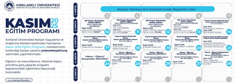 | KARİYER MERKEZİ KASIM 2025 EĞİTİM PROGRAMI YAYINLANDI  905 Okunma Kırklareli Üniversitesi Kariyer Uygulama ve Araştırma Merkezi tarafından hazırlanan Kasım 2025 Eğitim...  | ||