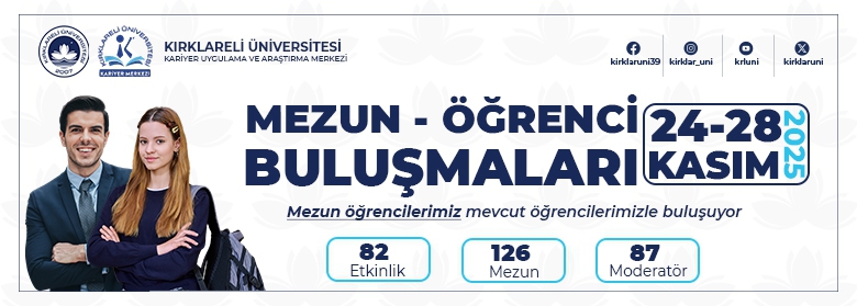 | MEZUN-ÖĞRENCİ BULUŞMALARI 24-28 KASIM 2025 TARİHLERİ ARASINDA TÜM KAMPÜSLERİMİZDE DÜZENLENECEKTİR  454 Okunma Kariyer Uygulama ve Araştırma Merkezimize bağlı olarak faaliyet gösteren Kırklareli Üniversitesi...  | ||