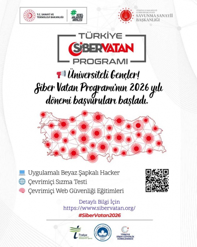 Sanayi ve Teknoloji Bakanlığı ile Savunma Sanayii Başkanlığı himayesinde, Cumhurbaşkanlığı Dijital Dönüşüm Ofisi destekleriyle yürütülen Türkiye Siber Vatan Programı’nın 2026 dönemi başvuruları başlamıştır. Program, ülke genelinde kalkınma ajanslarının koordinasyonunda gerçekleştirilmektedir.
